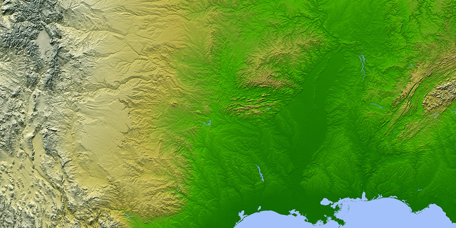 The Link Trail crosses the terrain shown below, generally along the 35° N parallel (found horizontally across the center of the NASA-JPL image below). The broad features include (left to right) the Rocky Mountains, High Plains (with visible Canadian River valley), Low Plains/basins (Lake Texoma and Arbuckle Uplift are visible), Interior Highlands (Ouachita Mountains are visible, including Lake Ouachita, below the Ozark Plateau), Mississippi Delta, Appalachian Foothills (with Tennessee River Valley and Wheeler Lake are visible) and Eastern Highlands (Appalachian Mountains).